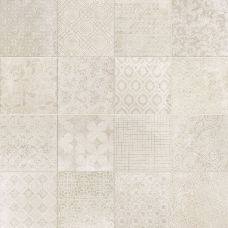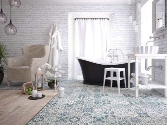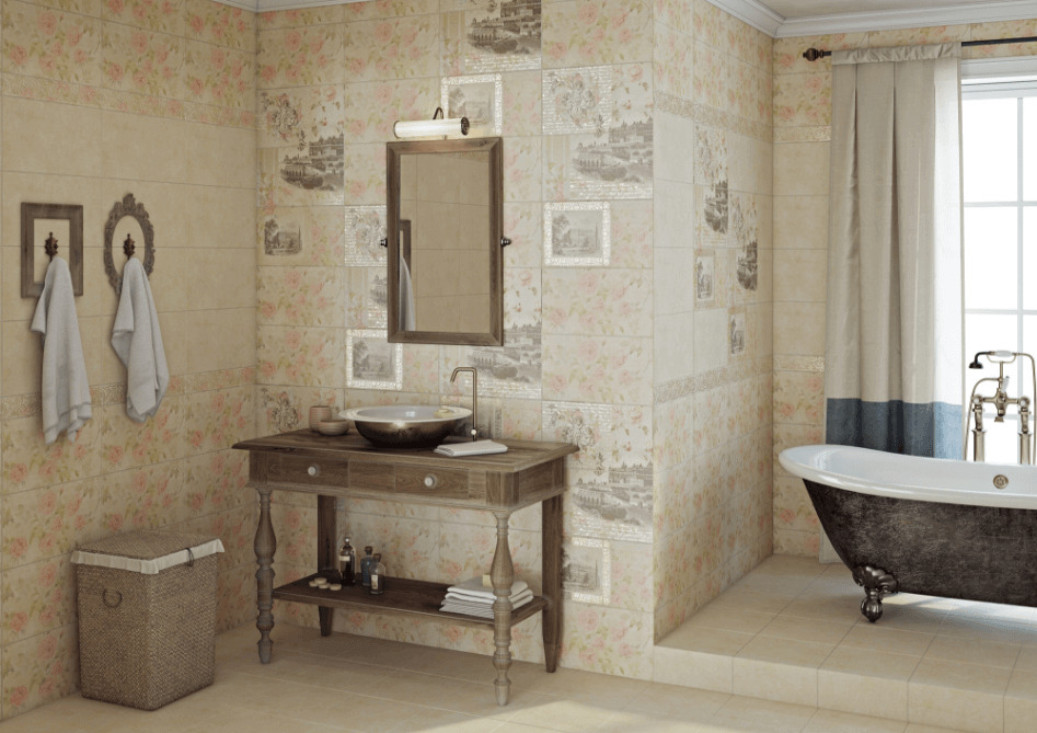 - An den Wänden des Badezimmers ist eine Fliese mit einem unscharfen Muster. Kopien von Plotkeramik werden zufällig eingefügt. Inseln mit monochromatischer Beschichtung entsprechen der Farbe des Bodens. Der Eindruck ist sehr alt, innen. Es scheint, dass wir die Fragmente der Wände mit verlorenen Kopien wiederherstellen mussten.