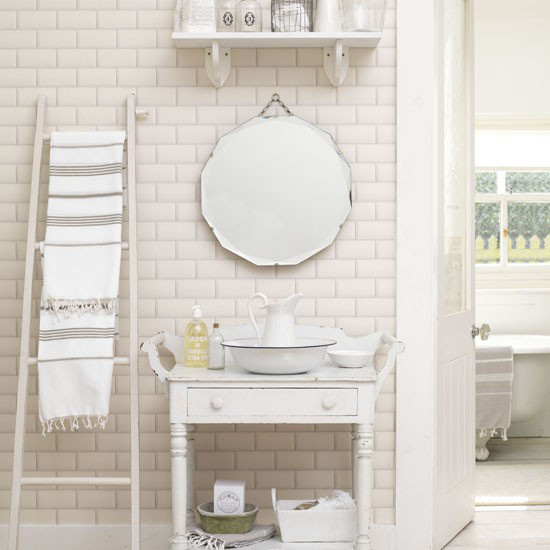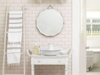- Im Badezimmer imitieren Wandfliesen weiße Ziegel mit klar definierten Nähten. Der helle Raum ist voller Antiquitäten.