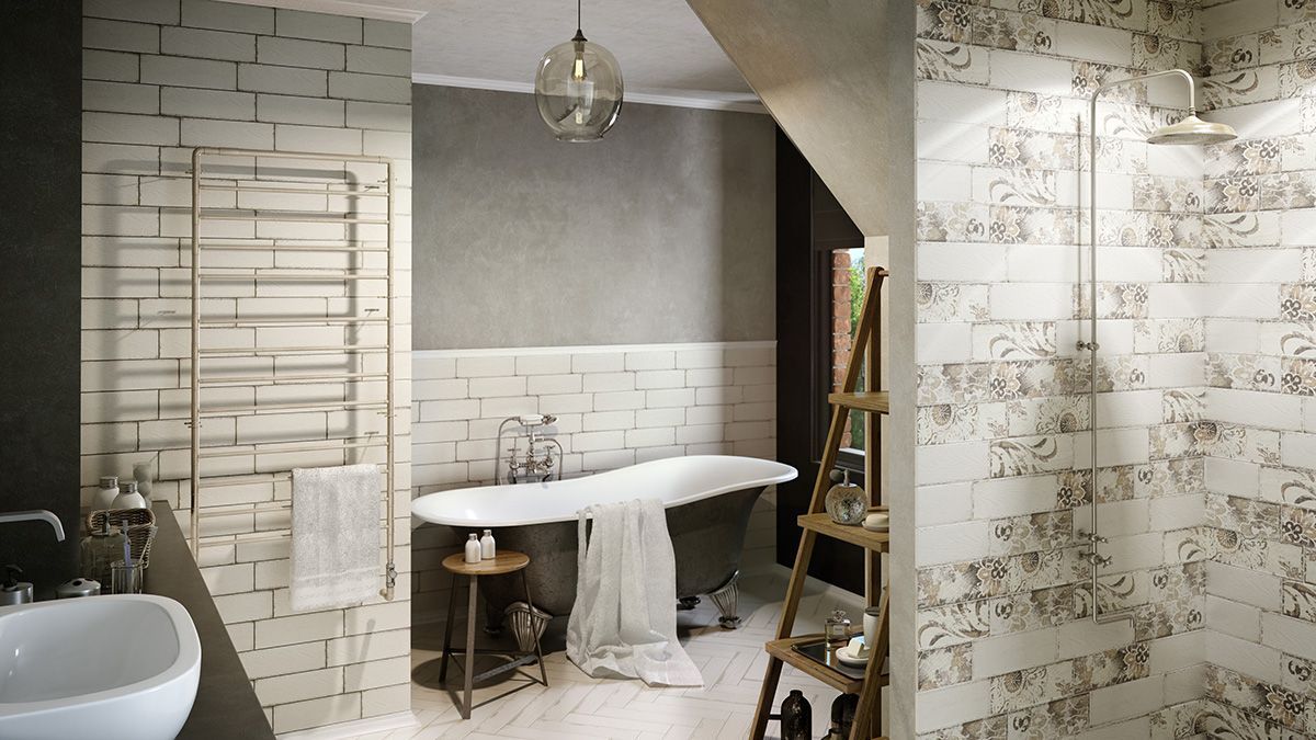 - Zwei Arten von Keramik sind in den Raum eingepasst, die schön aufeinander abgestimmt sind. Das helle Ziegelmauerwerk umrahmt die Wände und das Gewölbe. Auf einer großen Fliese, die um das Fenster herumgekleidet ist, sichtbare Nachbildung von Rissen, charakteristisch für "shabby chic".