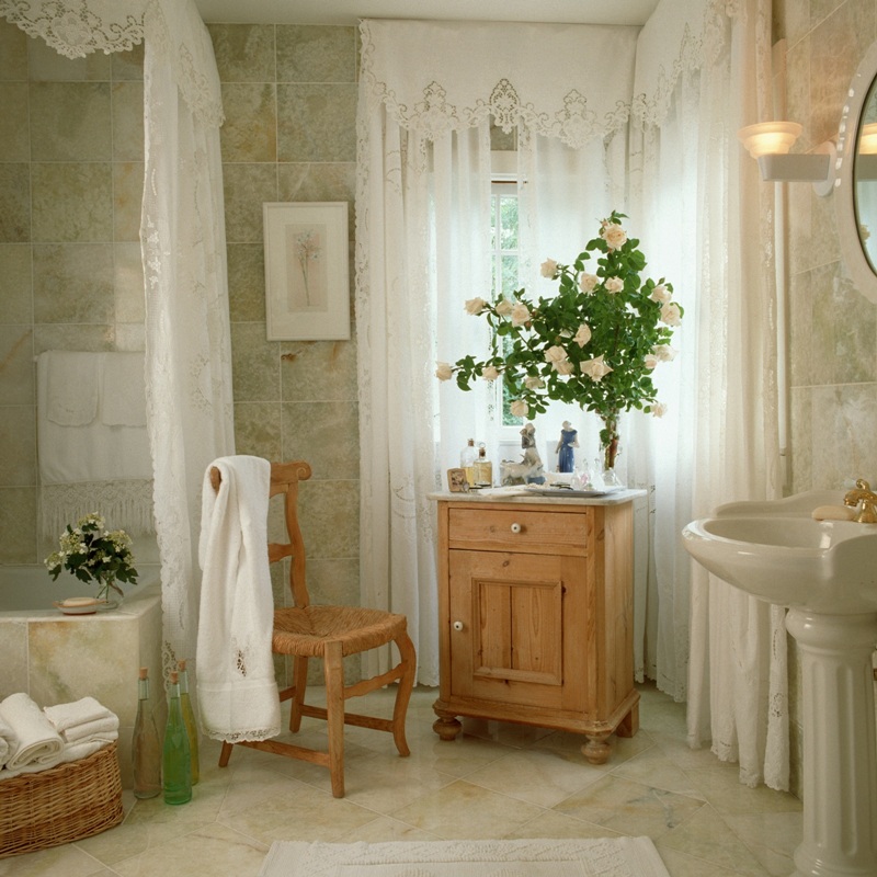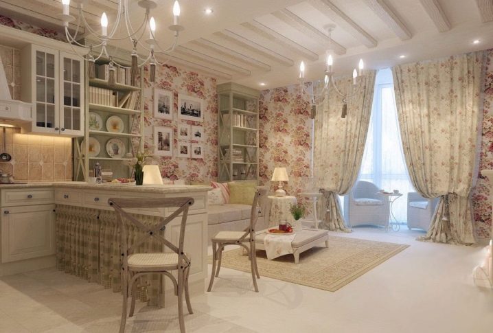 "Schäbiger Luxus" gelöst in einer ruhigen LichtfarbeEs gibt Antiquitäten, ein Gefühl der Antike in Kombination mit teuren Materialien. Zarte florale Ornamente können überall sein: auf Möbeln, Vorhängen, in Textilien. Trotz der Vorliebe von gleichmäßigen Farbtönen der Verkleidung, kann es mit Fliesen mit einem unauffälligen Muster verdünnt werden.