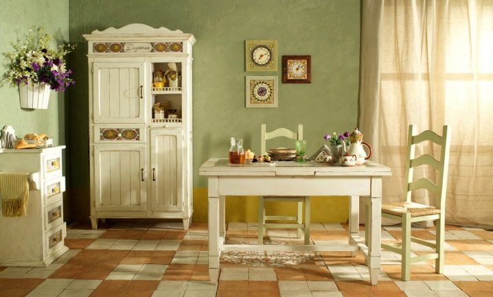 Wenn Sie einen Stil von "schäbigem Luxus" schaffen, sollten Sie auf das gesamte Interieur achten.Richtig ausgewählte Möbel müssen mit gealterten Fliesen kombiniert werden, sonst sieht das Futter unordentlich aus.