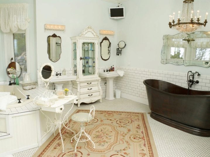 - Im Raum ist Keramik auf dem Boden und an der Wand mit Waschbecken vorhanden. Fliesen mit verschiedenen Texturen und Mustern werden mit Möbeln und Textildekorationen kombiniert. Das Vorhandensein von Antiquitäten ist in den Spiegeln angegeben.
