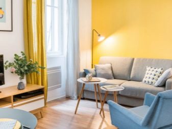 Eine wichtige Nuance bei der Auswahl von Farbtönen für das zukünftige Design ist eine Kombination aus warmen und kalten Farbtönen, die das Fehlen der einen oder anderen Komponente im Farbschema ausgleichen. Zum Beispiel ist die gelbe Farbe sofort, lebhaft und sehr aktiv, mit dem Ergebnis, dass sie den Raum leicht überlasten können, aber in Kombination mit mehr "kühlen" Schattierungen wird es ein heller Akzent, der nur den Raum schmückt.