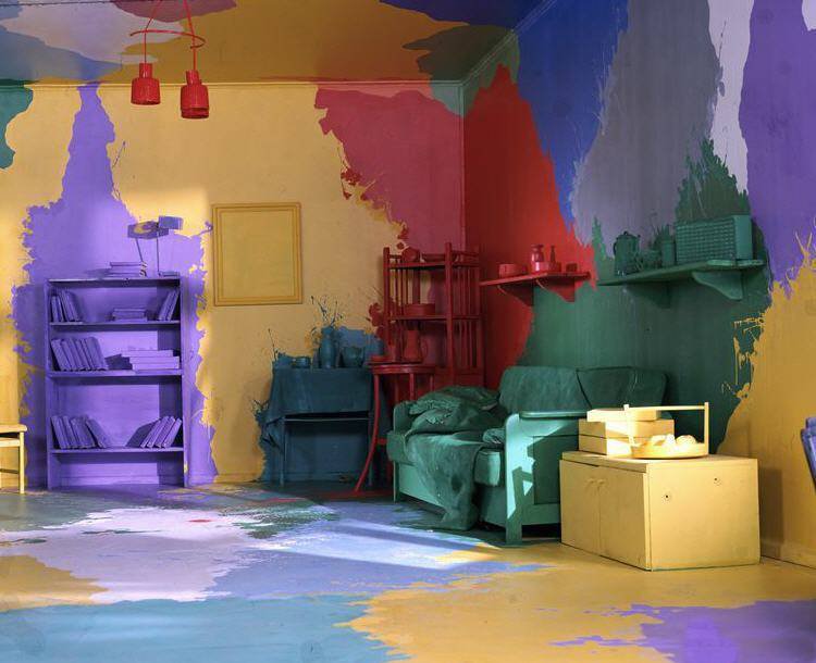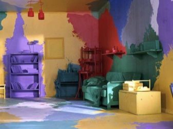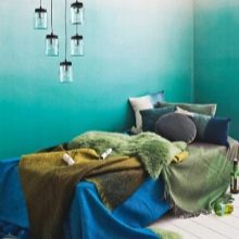 Darüber hinaus können die Kanten der Färbung glatt und scharf sein und können uneben und verschwommen sein. Daher wird üblicherweise eine Akzentwand gebildet. Zusätzlich können Sie auf der Oberfläche ungewöhnliche bunte Flecken und Flecken machen. Dies ist eine großartige Lösung für moderne Innenräume.
