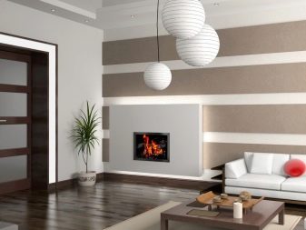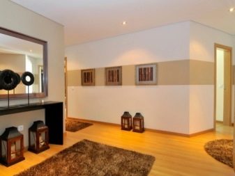 Diese Dekoration wird öfter in Fluren und Wohnzimmern verwendet: Empfang ermöglicht es Ihnen, den Raum breiter zu machen. Die Option eignet sich auch für die Dekoration der Wand im Kinderzimmer - Sie können Kinderzeichnungen und andere Handarbeiten auf kontrastierenden Streifen hängen. Die Linie kann entweder monochrom oder zwei- oder dreifarbig sein. Die Farben werden entsprechend dem weichen Übergang ausgewählt.