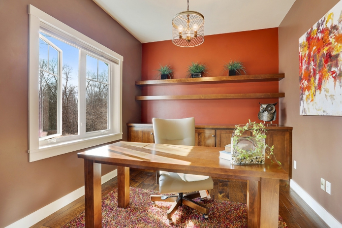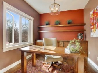 Dieses Design beinhaltet die Gestaltung der Wände in einem monochromen Farbton, aber die Projektionen, Nischen, sowie andere Innenausstattung, sogar einige Regale und Möbelstücke sind mit einem helleren Farbton gemalt. Ein Zimmer mit einer ähnlichen Lösung sieht heller und stilvoller aus. Die Rezeption mit einem koloristischen Akzent wird am häufigsten in modernen Innenräumen verwendet. In einigen Fällen werden die Konturen der Wände und der Ecken auch mit intensiver Farbe hervorgehoben, um den Raum mit "Luft" zu füllen.