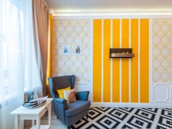 In modernen minimalistischen Interieurs können Sie den Eindruck einer bewusst sorglosen Malerei aufkommen lassen. Zu diesem Zweck hinterlassen sie besonders lange dünne Flecken von der Decke bis zum Boden. Solche Entscheidungen in verschiedenen Farbkombinationen sind typisch für Pop Art oder Loft Styles.
