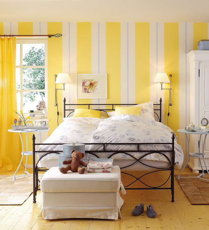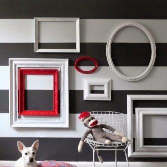 Zeichnen Sie so oft nicht alle Wände, sondern nur ein oder zwei. Der Streifen kann horizontal oder vertikal sein. Sie können in verschiedenen Kombinationen hergestellt werden - zwei, drei oder mehr Farben, aber sie sind so ausgewählt, dass sie neben der Farbe der Wände noch irgendwo im Inneren sind.