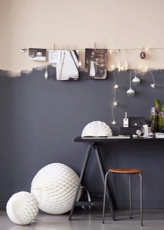 Dies ist eine Standard-Raummalerei in zwei Grundtönen. Gleichzeitig ist die horizontale Teilung beliebt. Der untere Teil ist mit dunklen oder hellen Schattierungen und der obere dagegen heller. So können Sie die Wände im Treppenhaus oder auf dem Balkon anordnen.