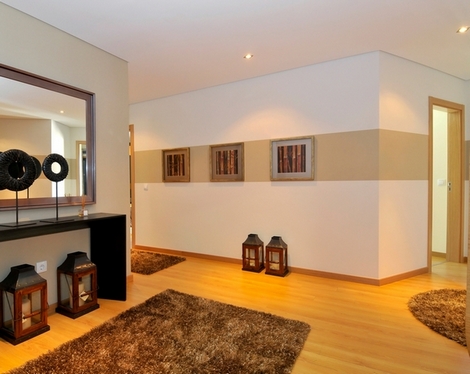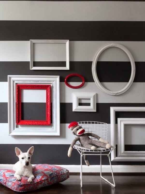 Dieses Design sieht ziemlich ungewöhnlich aus.In der Regel wird dieses Band auf Augenhöhe platziert. In dieser Zone werden üblicherweise Fotos, Gemälde und andere dekorative Objekte an der Wand aufgehängt. Gewöhnlich hat der Streifen einen helleren oder dunkleren Farbton als der Rest der Beschichtung, was die an den Wänden befindlichen Dekorelemente betont und hervorhebt.