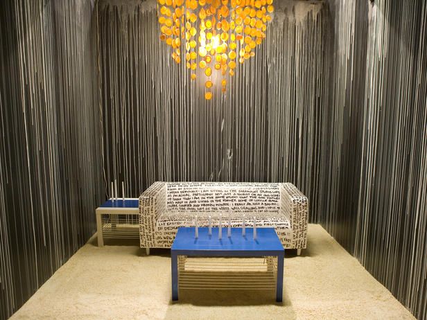 Diese Wand muss nicht mit zusätzlichen Elementen verziert werden. Es wird sehr ungewöhnlich und stilvoll aussehen. Um zu erstellen, wählen Sie eine Grundfarbe als Hintergrund, und die zweite Farbe wird von oben nach unten mit dünnen, wenn fließenden Streifen abgesenkt.