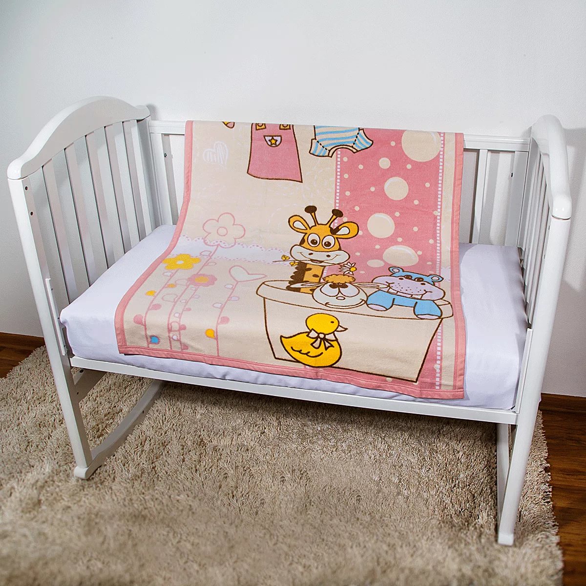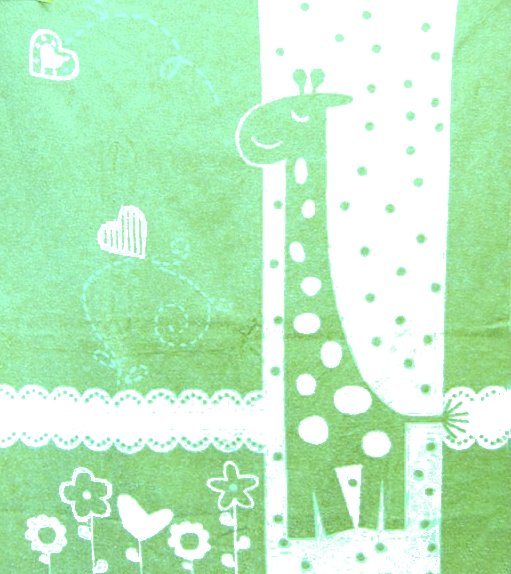 Für gemütliche und gemütliche Spaziergänge Gut angepasste grüne Decke mit weißen Streifen. Grün wird meistens für Jungen gewählt, aber es ist perfekt für Mädchen. Blumen, Herzen und ein Punktmuster zieren die Bettdecke. Und die Hauptfigur ist eine lächelnde und leicht verschlafene Giraffe. Unter einem solchen Teppich wird das Kind in der freien Luft sanft und süß schlafen.