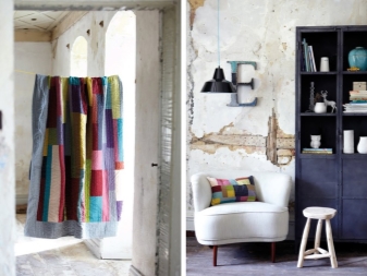 Es wird angenommen, dass die Dinge im Patchwork in einfachen Stilen wie verwendet werden Provence. Der Innenraum mit Akzenten auf Textilien aus Patches kann jedoch nicht nur in rustikal, sondern auch in einer Reihe von modernen Stilen gemacht werden Loft, Land, Art Deco, Meer oder Ethno. Patchwork-Dinge werden sie nicht vereinfachen, aber im Gegenteil, sie werden weicher und werden zu einem hellen Akzent, der Komfort verleiht.