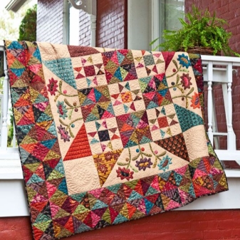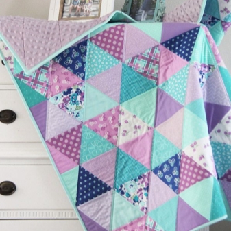 - Aus Dreiecken. Das dreieckige Muster auf der Decke sieht kleiner und bunter aus als das Quadrat. Häufigere farbige Dreiecke sind so zusammengesetzt, dass sie ein Quadrat bilden. Es wird auf jedem Quiltmuster, basierend auf dem Wechsel der Figuren, gut aussehen.
