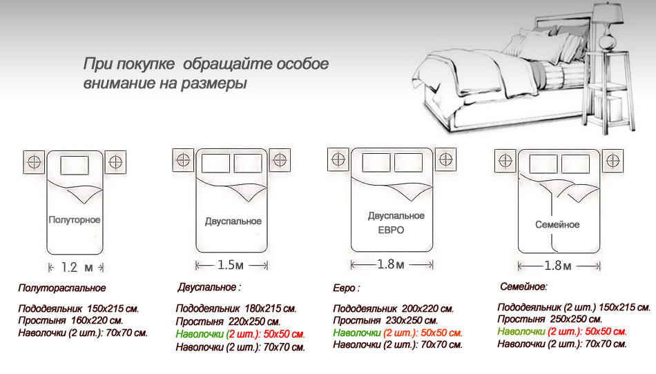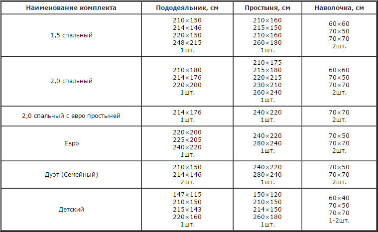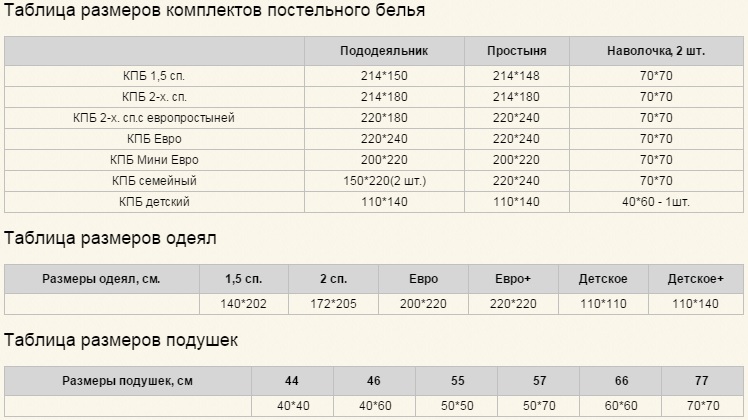 Die russische Größenpalette von Decken besteht heute aus 8 verschiedenen Parametern für Kinder und Erwachsene. Auf Kosten von ausländischen Unternehmen wurde das Messspektrum erheblich erweitert, so dass Sie die für die vorhandenen Möbel am besten geeignete Option auswählen oder die Eigenschaften des Körpers einer bestimmten Person berücksichtigen können (wichtig für Benutzer mit Übergewicht). Für die Bequemlichkeit der Wahl sind die festgestellten Größen in mehrere Gruppen geteilt, deren Anzahl auf einmal wegen der Produktion von speziellen Möbeln zugenommen hat,der "Euro" genannt.