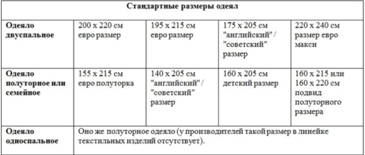 Die Definition von klaren Abmessungen war auf die Notwendigkeit zurückzuführen, die Wärme des Körpers des Benutzers unter Berücksichtigung des Komforts richtig zu halten. Die Größen der Decken, die in einem freien Zustand gemessen werden, folgen den entwickelten Standards (zum Beispiel, Russisch GOST R 51554-99), sie unterscheiden sich in den verschiedenen Ländern, können eine leichte Abweichung von der festgelegten Norm zulassen (nicht mehr als 3%).
