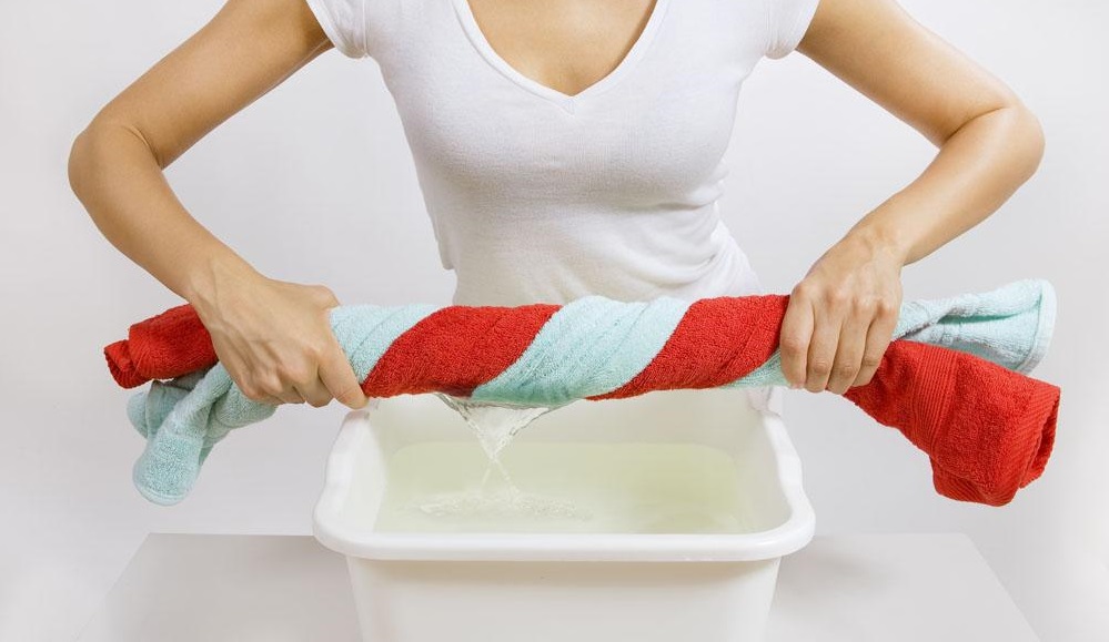 - Warten Sie nach dem Abspülen, bis das Wasser abläuft, und trocknen Sie die Decke in der begradigten Form. Es ist nicht notwendig, das Produkt zu drücken und loszuschrauben, um seine Verformung zu vermeiden. Es wird nicht empfohlen, es aufzuhängen.