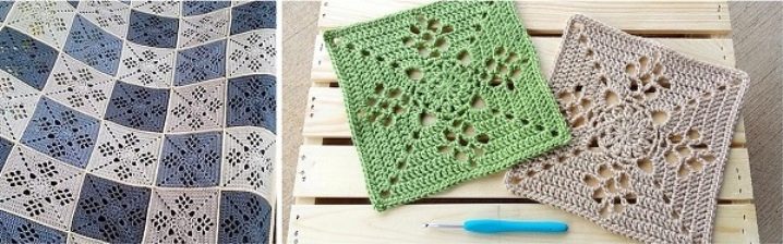 In der Mitte müssen Sie die Quadrate von 28 Zeilen verknüpfen. Nachdem Sie 24 Reihen verbunden haben, ordnen Sie die Figuren wie folgt an: 2, 3, 1 (Muster werden in jeder Zeile verschoben). Am Ende schließt alles mit einer Krausatznaht. Mit einem Haken geben die Kanten Stärke und ordentliches Aussehen.