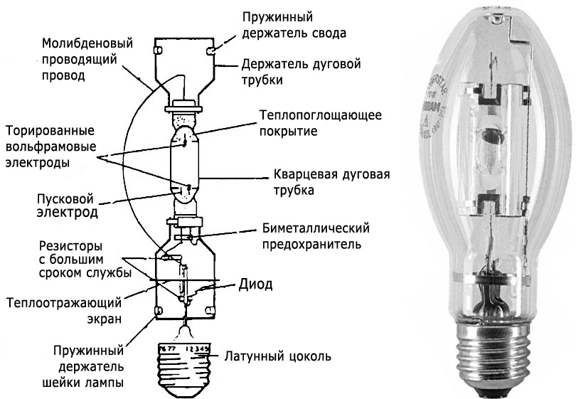 Der Brenner ist mit Inertgasen und Verunreinigungen von Metallhalogeniden gefüllt, die für das gesamte Emissionsspektrum notwendig sind (schließlich liefert Quecksilber nicht alle Farben). Wenn die Metallhalogenidlampe abschaltet, werden die chemischen Komponenten in einer dünnen Schicht auf der Oberfläche des Brenners abgeschieden. Wenn es angeschaltet wird, dauert es einige Zeit, um alle Komponenten aufzuwärmen. Verdunstung, Quecksilber und andere chemische Elemente emittieren Licht. Hier spielt der äußere Kolben eine sehr wichtige Rolle - er behält die Hitze bei, lässt die Struktur nicht abkühlen und verlängert dadurch die Lebensdauer des Brenners.