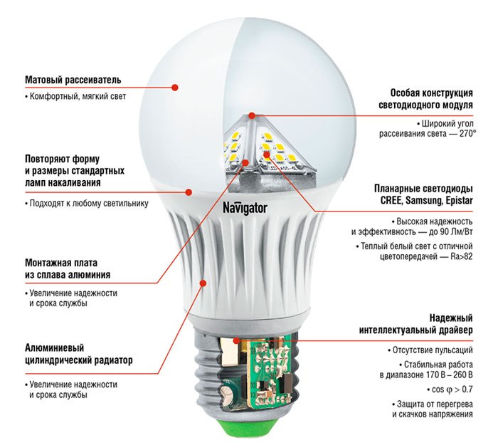 Im Gegensatz zu einer gewöhnlichen Ilyich-Glühbirne besteht eine LED aus vielen kleinen Elementen, die auf einer speziellen Plattform mit Strompfaden kombiniert sind, da jede einzelne Diode zu klein ist, um den gesamten Raum zu beleuchten.