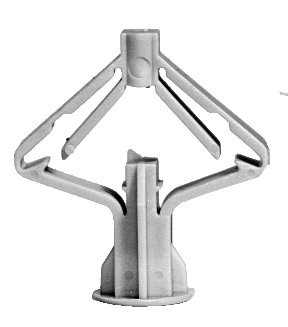Diese Version des Befestigungselements unterscheidet sich deutlich von der vorherigen. Die Distanzstücke sind viel größer, innen befinden sich auch einige spezielle "Zungen", die zusätzliche Sicherheit bei der Befestigung des Dübels bieten. Dies ist die häufigste Art von Dübel "Schmetterlinge" von allen auf dem heutigen Markt angeboten.