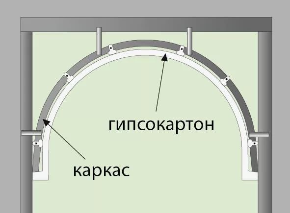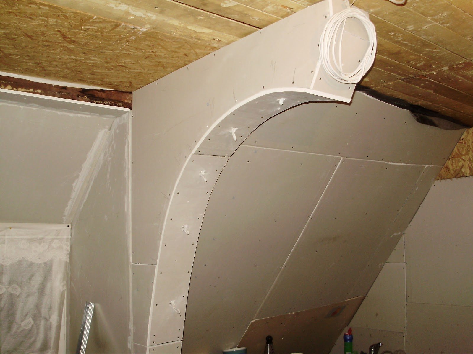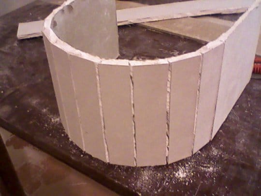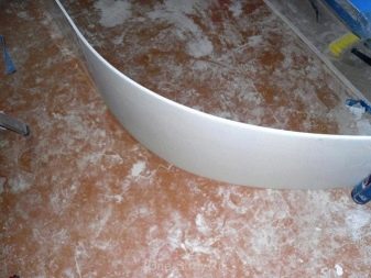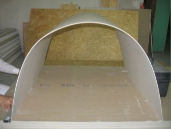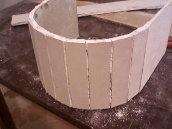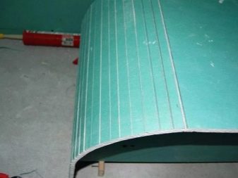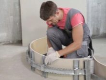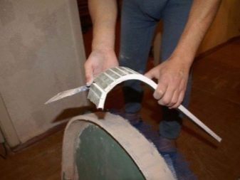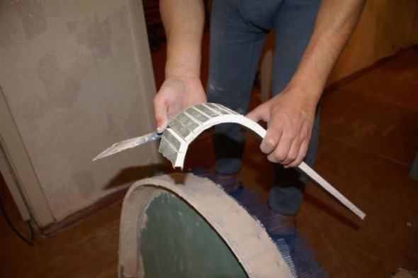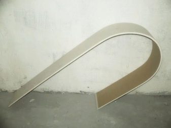 Je schmaler das Element ist, desto leichter ist es, es zu biegen. Bei Verwendung von Streifen bis 200 mm Breite gibt es keine Probleme. Solch ein Detail kann einfach auf der Schablone fixiert und für eine bestimmte Zeit gehalten werden, dies wird genug sein, damit die Gipsplatte die notwendige Form annimmt.