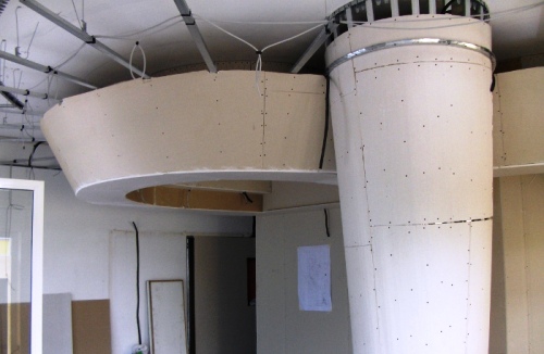 - Hinter den krummlinigen Figuren des Innenraums lässt sich sehr leicht verschiedene Kommunikation verbergen, ohne das Gesamtbild zu verlieren. Außerdem ist Gips hochtemperaturbeständig, so dass elektrische Kabel sicher unter ihm geführt werden können.