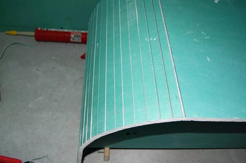 Es ist möglich, Trockenbau mit einem scharfen Messer zu biegen, diese Methode ist für Platten von fast jeder Dicke geeignet. Schneiden Sie dazu an mehreren Stellen die Materialstärke ab. Wie viele Schlitze benötigt werden, hängt vom Radius der gewünschten Biegung ab. Je steiler es ist, desto öfter muss das Teil durchgeschnitten werden. Diese Methode benötigt keine Feuchtigkeit.