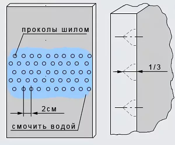 - Nasser Schwamm mit flüssigkeitsbehandelter Oberfläche getränkt. Das Fragment sollte für ungefähr eine Stunde benetzt werden, aber eine Benetzung der Rückseite des Teils ist nicht erlaubt. Dies muss verhindert werden, um Materialbrüche zu vermeiden.