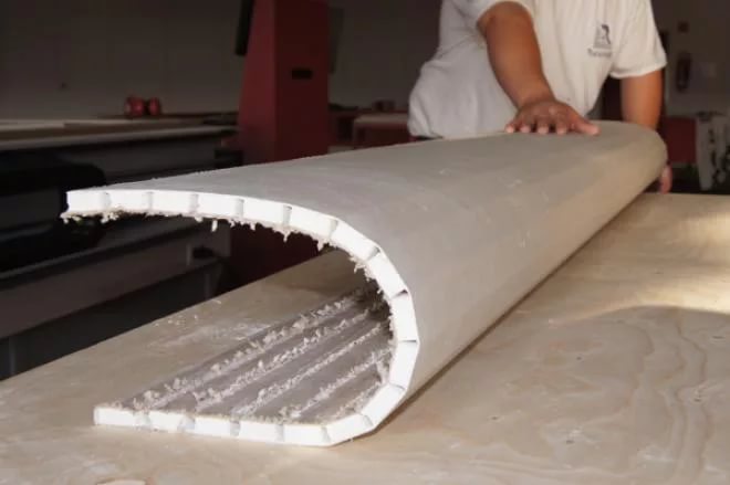 - Stoffe mit einer Dicke von 0,125 cm sind für Produkte mit einem Radius von mehr als 1.800 mm geeignet. Es wird empfohlen, solche Zuschnitte nur in der Hitze zu biegen und zusätzlich während der Arbeit aufzuwärmen.