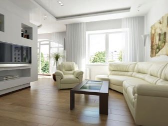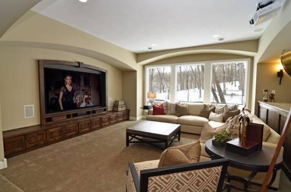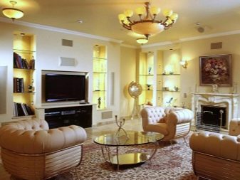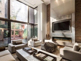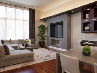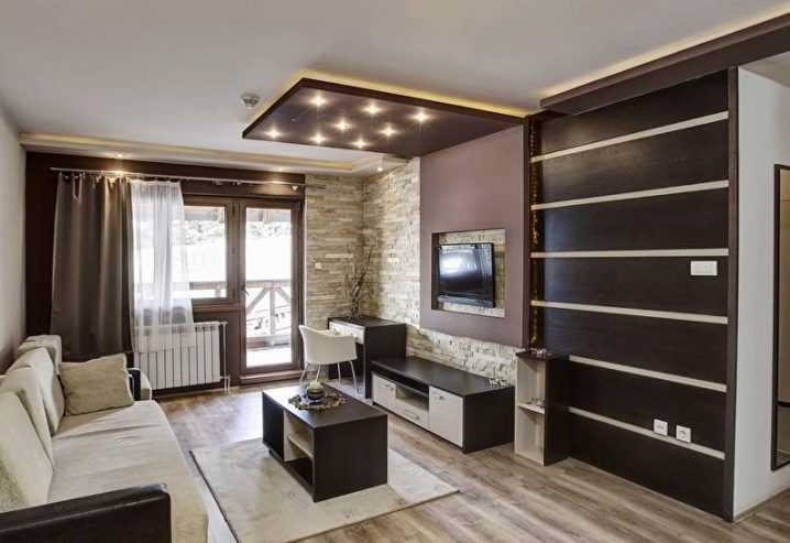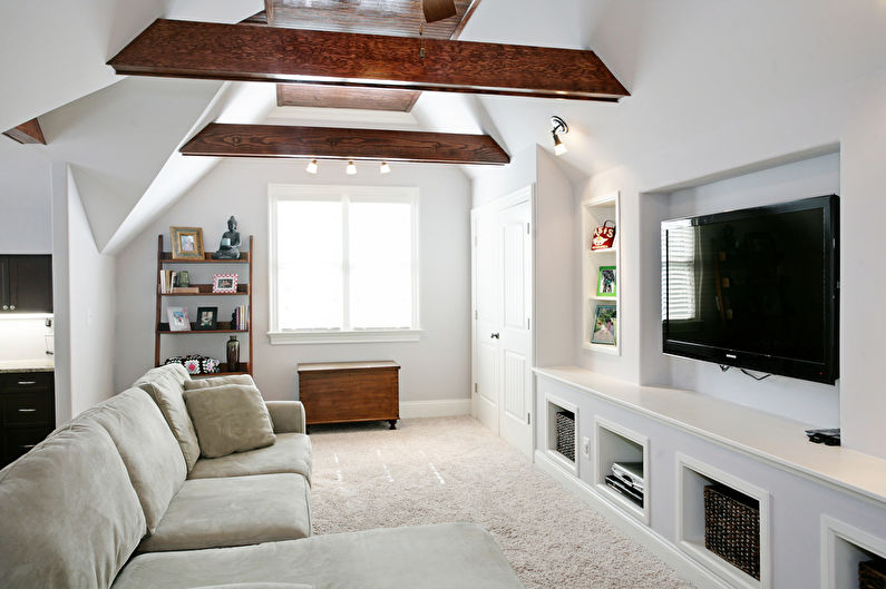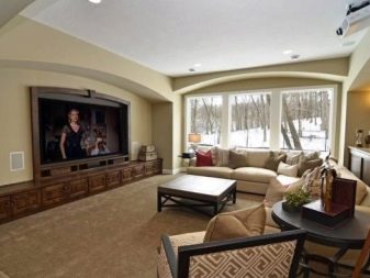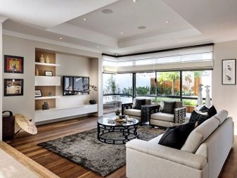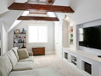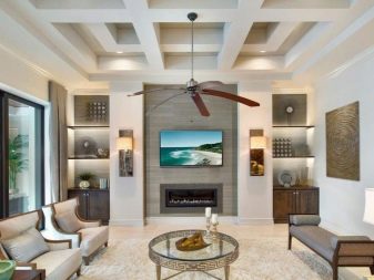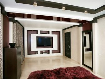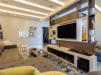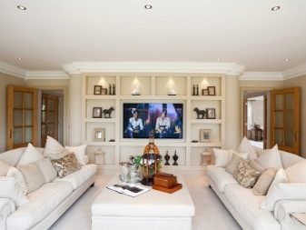 Es ist nicht notwendig, zusätzliche Regale für die Aufbewahrung von Gegenständen oder die Dekoration eines Raumes zu schaffen. Alles hängt von den individuellen Vorlieben der Besitzer des Hauses ab. So wird das Design zu einer Art Box, in deren Mitte ein Fernseher installiert wird.