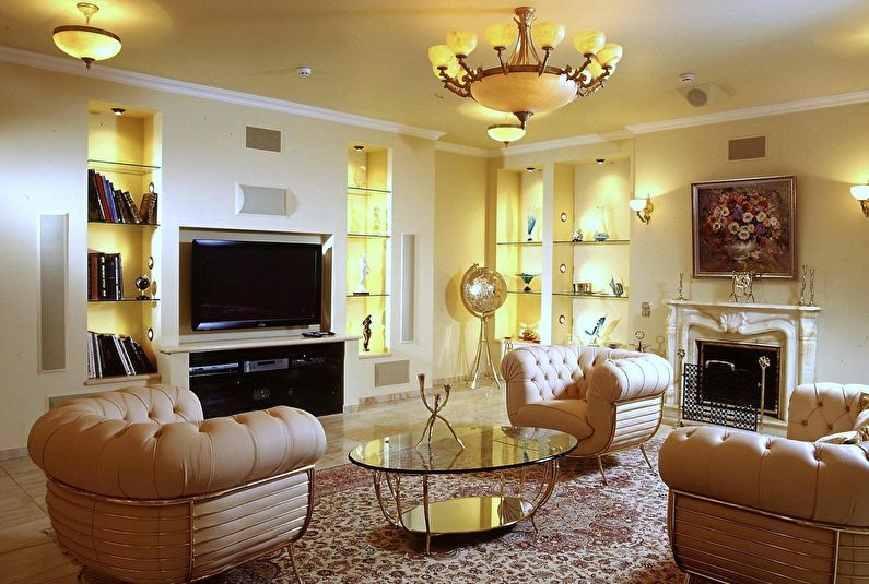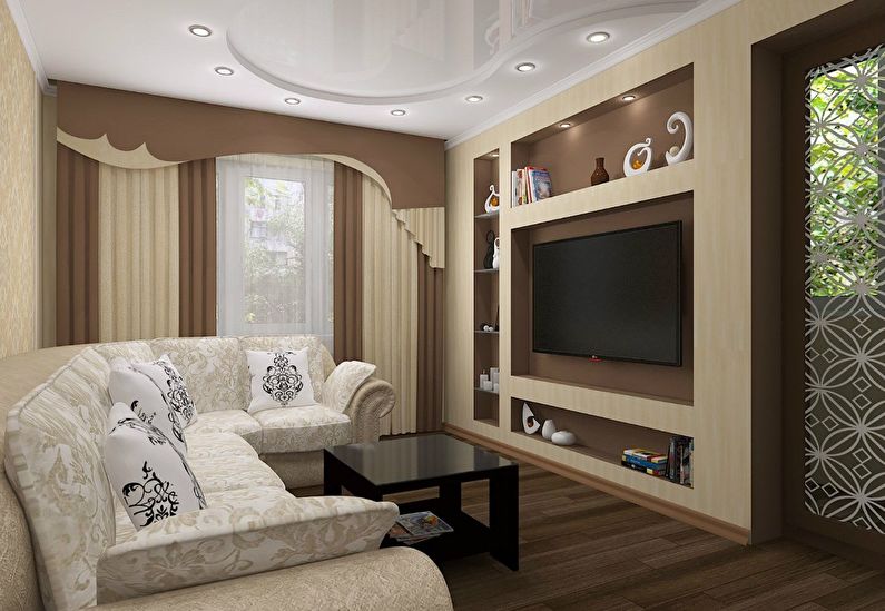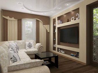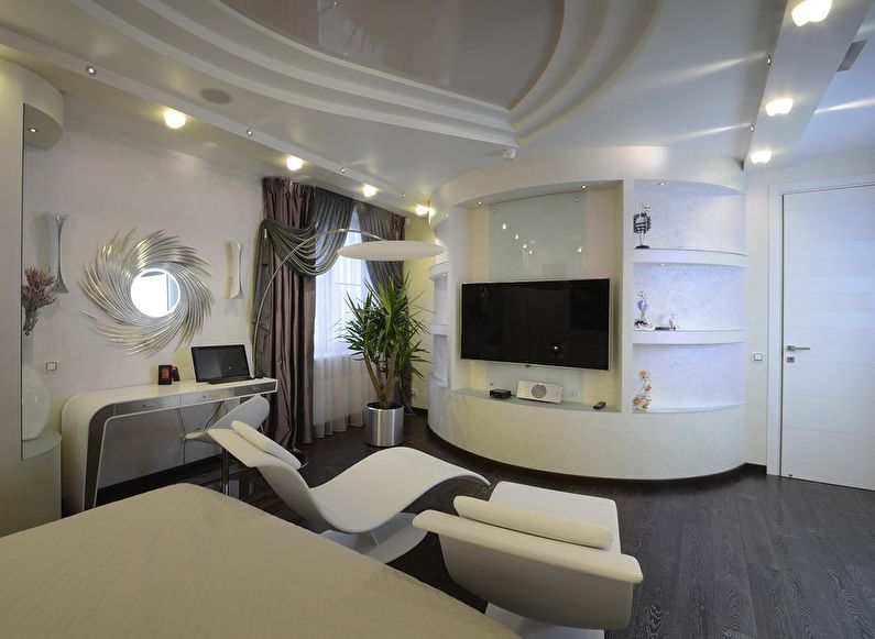 - Oval Nische. Es ist eine originelle Lösung. Nur für große Räume geeignet. Der Fernseher befindet sich in der Mitte des Kreises, was dem Raum einen stilvollen und modernen Look verleiht.