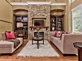 - Vertikale Nische mit zwei zusätzlichen Regalen, die für TV und Kamin verwendet werden. Diese Option ist eine stilvolle Lösung für das Wohnzimmer.