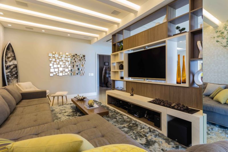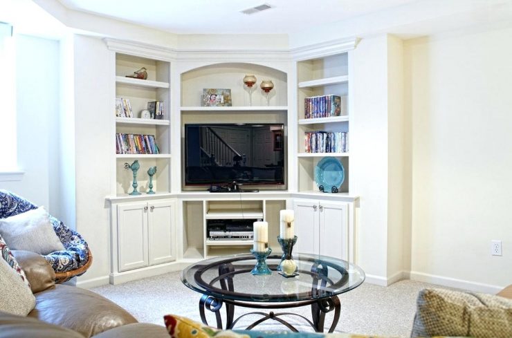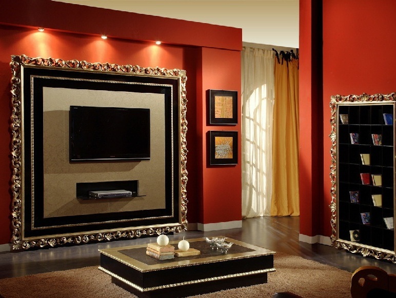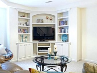- Gipskartonkonstruktion. Erinnert eine zusätzliche Wand mit massiven Regalen und Platz für TV. In der Regel sind die Regale offen und dienen zur Dekoration. Zum Beispiel sind verschiedene Statuetten, Blumen, Fotografien und andere Kleinigkeiten installiert, die einfach das Auge erfreuen werden.
