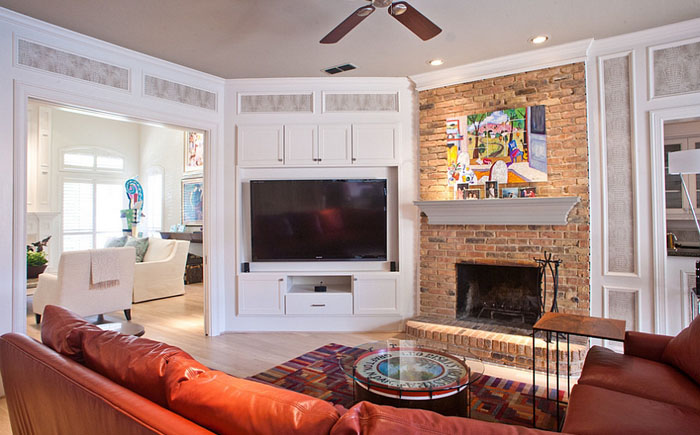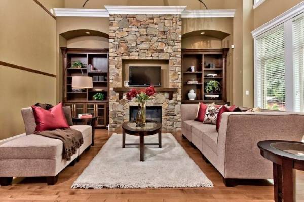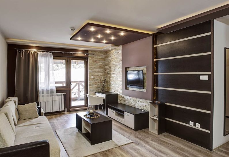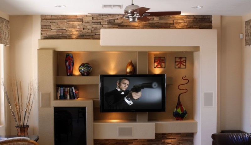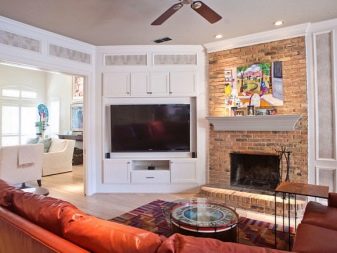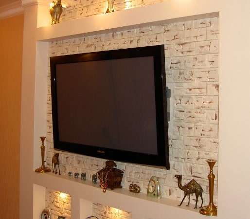 - Stein In der Regel wird nur künstlich verwendet. Es ist sehr einfach zu bedienen und einfach. Die Hauptwand ist mit einem Stein befestigt, auf dem der Fernseher montiert ist. Eine solche Entscheidung fügt noch mehr Platz hinzu.
