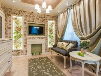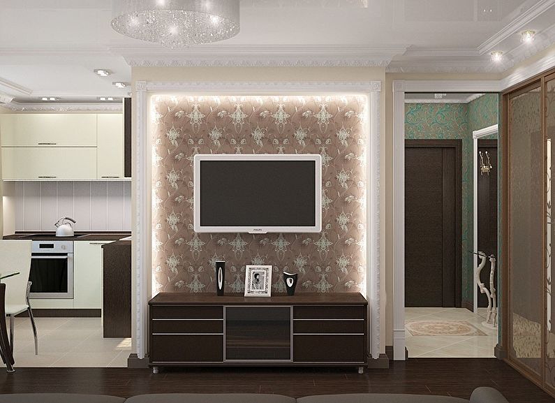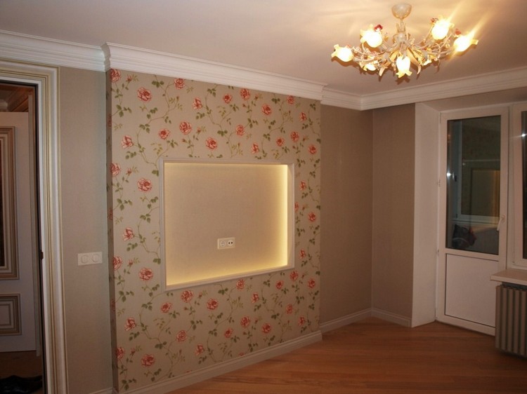 - Hintergrundbild. Sind die günstigsten Optionen abgeschlossen? Oft für eine Nische verwenden Sie die gleiche Tapete, die den Raum eingefügt. In diesem Fall ist der Fernseher vollständig mit dem Rest des Innenraums verschmolzen und maskiert.