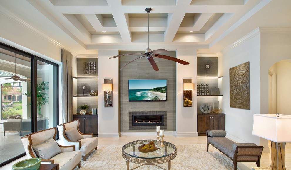 - Vertikal Nische. Hauptsächlich für den visuellen Effekt der hohen Decke verwendet. Der Rest des Raumes sind Regale, die entlang der gesamten Wand angeordnet sein können. Der Fernseher ist in diesem Fall in der Mitte.