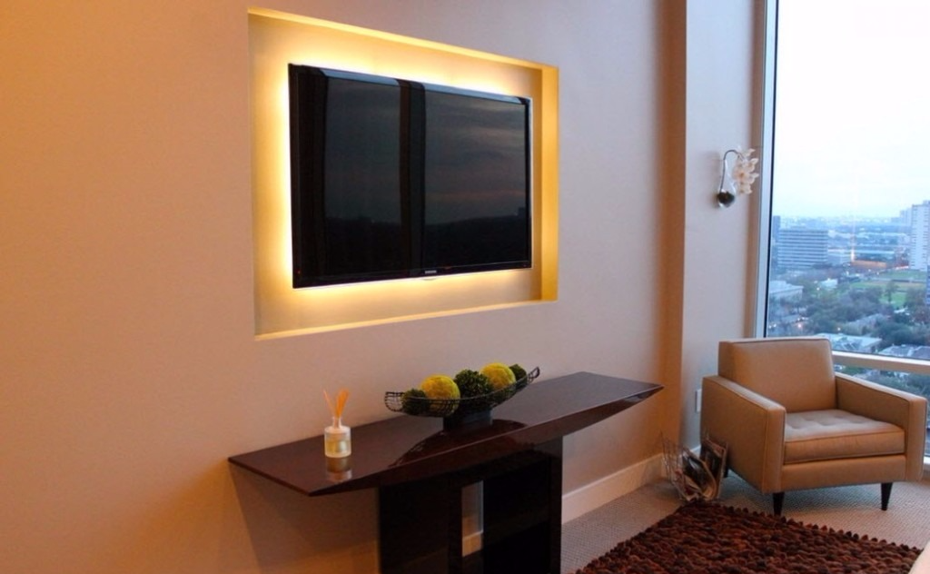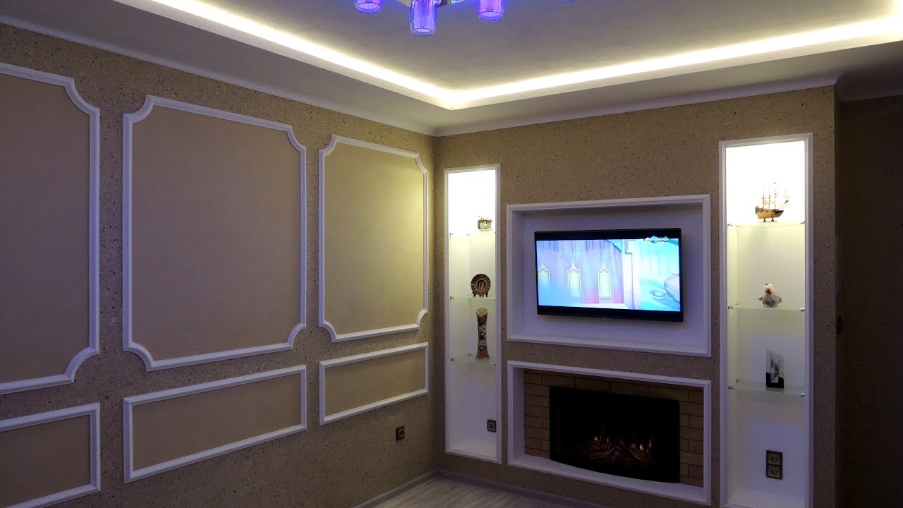 Gipskarton Nische unter dem TV wird Ihren Wohnkomfort geben, sowie zu einem "Highlight" im Innenraum werden.
