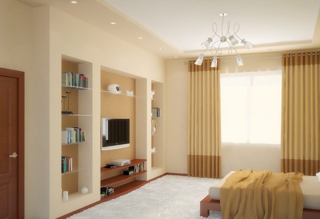 Wenn die TV-Nische im Schlafzimmer installiert ist, sollten Sie warme, sanfte und helle Farben zur Dekoration wählen. Es wird also nicht viel Platz in Anspruch nehmen.Für das Schlafzimmer ist in der Regel ein kleiner Raum vorgesehen. Deshalb sollten Sie eine Nische von mittlerer oder sogar kleiner Größe machen. In diesem Fall genügt ein Regalpaar als zusätzlicher Stauraum.