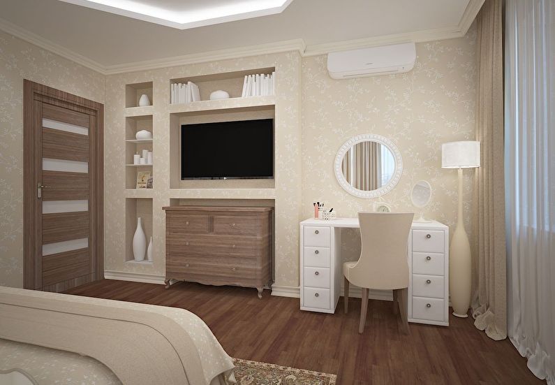 Die symmetrische Form der TV-Nischenregale wird perfekt mit dem klassischen Interieur kombiniert. Diese Designoption ist ideal für das Schlafzimmer.