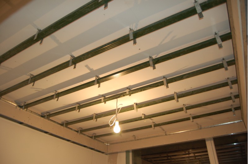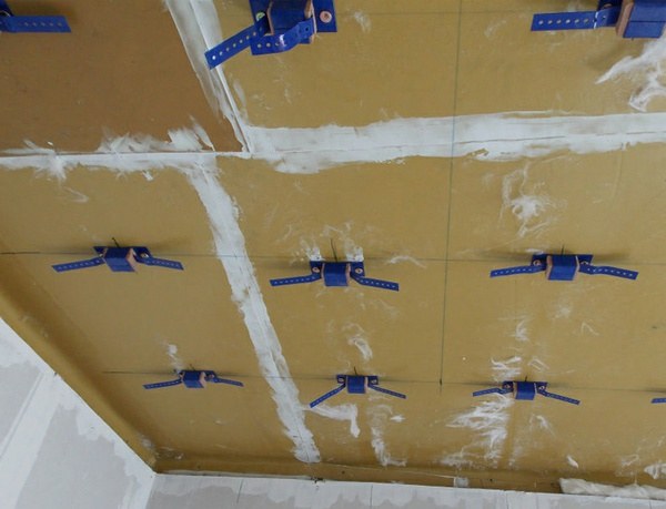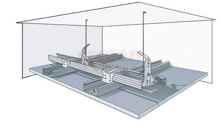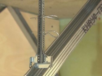 Sie sollten darauf achten, dass nach der Montage der Aufhängungen und vor der Befestigung der Profile die Isolierung und die Geräuschdämmung angebracht sind. Auf den von den Aufhängern gebildeten "Ohren" werden Isolierplatten getragen, und ihre Ränder sind nach innen vom Rahmen gebogen.