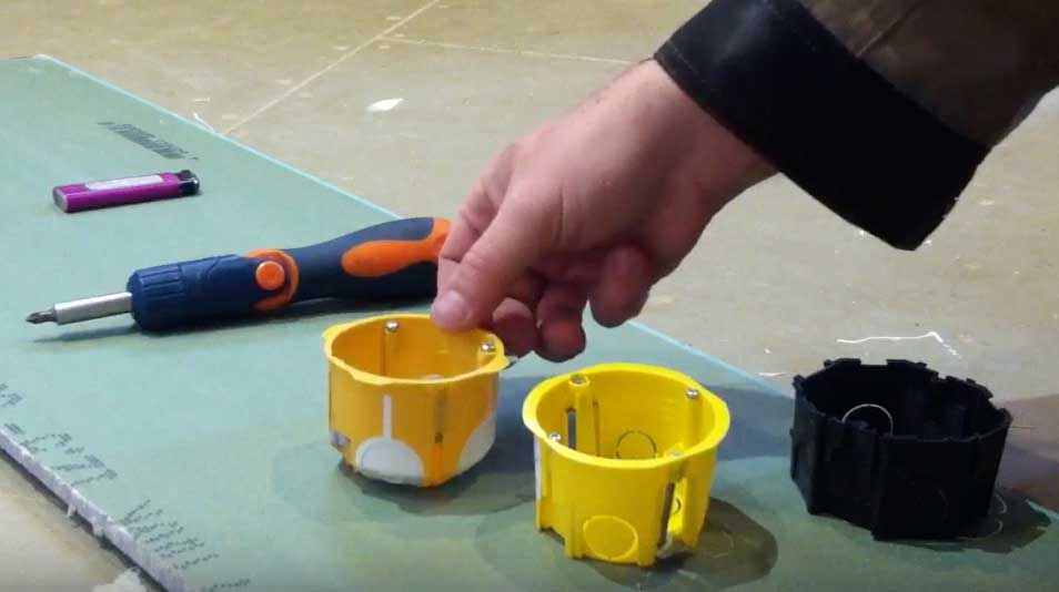 Vor der Installation ist es notwendig, ein Loch zu machen, wo die Drähte passieren werden. Weiter durch die Installationsbox müssen Sie den Draht spannen. Es muss in das Loch gesteckt und mit Hilfe der Füße fixiert werden. Aber Sie müssen auch wissen, dass einige Boxen eine Nut mit einem fließenden Übergang haben. Daher stellt sich heraus, dass der Fuß in der Nähe der Unterseite der Unterseite des Fußes fast in die Nut eingelassen ist. Wenn die Schraube jedoch festgezogen wird, ragt sie langsam über die Oberseite hinaus. Dadurch können Sie die Unterseite sichern.