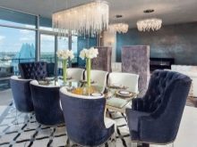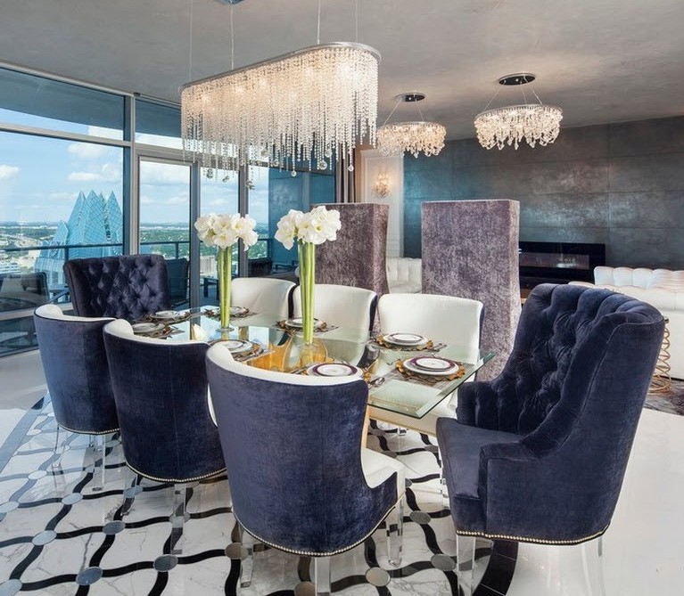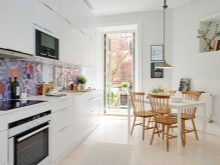 Es ist hinzuzufügen, Einsätze von hellen Farben, und das Innere wird eine spielerischen Noten erhält auf einer Küche ist schön Frühstück mit Croissants und Kaffee. Die Situation sollte unauffällig sein, diese Farben zu wiederholen, während die grundlegenden weißen Hintergrund gehalten wird, zum Beispiel, können Sie Stühle unter Farbeinlagen setzen.