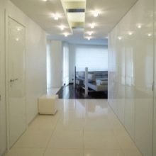 In einem engen Korridor lohnt es sich, die weiße Fliese diagonal zu verlegen und mit kontrastierenden Details zu dekorieren, was den Raum zwischen den Wänden sehr schmücken und erweitern wird. Der Flur erhält zusätzliche Beleuchtung aus der weißen Farbe des Feinsteinzeugs, ist mit Luft und Sauberkeit gefüllt.