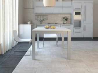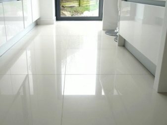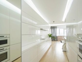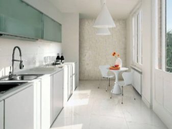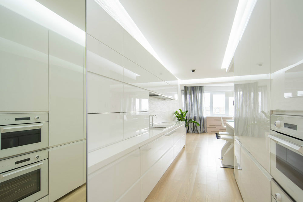 Das glänzend weiße Design wirkt durch die gute Beleuchtung der schmalen Küche noch strahlender. Es ist besser, eine korrigierte Bodenfliese zu wählen, um einen nahtlosen Stoff zu schaffen. Es ist passend zu den Wänden, Küchenmöbeln und Accessoires ausgewählt. Der Innenraum ist so einfach und frei von Details gemacht. Minimalismus in Dekoration und Dekor wird die Küche stilvoll und komfortabel machen.