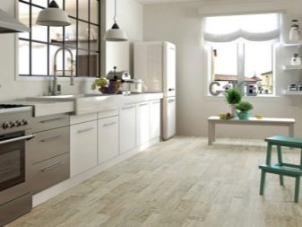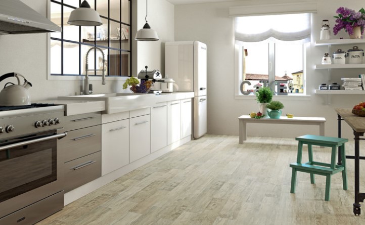 Für diejenigen, die das ländliche Leben fühlen wollen, würde der Holzboden die beste Wahl sein, aber in der Küche eine solche Deckung ist unpraktisch, ist Fliesen leichter sauber zu halten als Naturholz, die im Laufe der Zeit und absorbieren Spritzer Koch dunkelt.