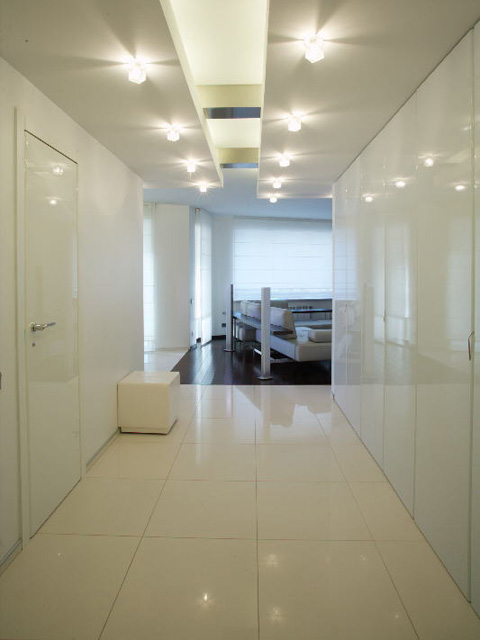 Praktikabilität und Leichtigkeit in der Pflege des Abschlussmaterials von Kunststein ermöglicht sogar die Verwendung von schillernden Farben in der Dekoration des Eingangsbereichs. Ein kleiner Flur, der mit den gleichen weißen Fliesen verkleidet ist wie der Raum, sieht nicht wie ein kleiner Lagerraum aus, sondern wird zu einem vollwertigen Bestandteil des Interieurs, der über seine Grenzen hinausgeht und Teil eines hellen und supermodernen Raumes wird.