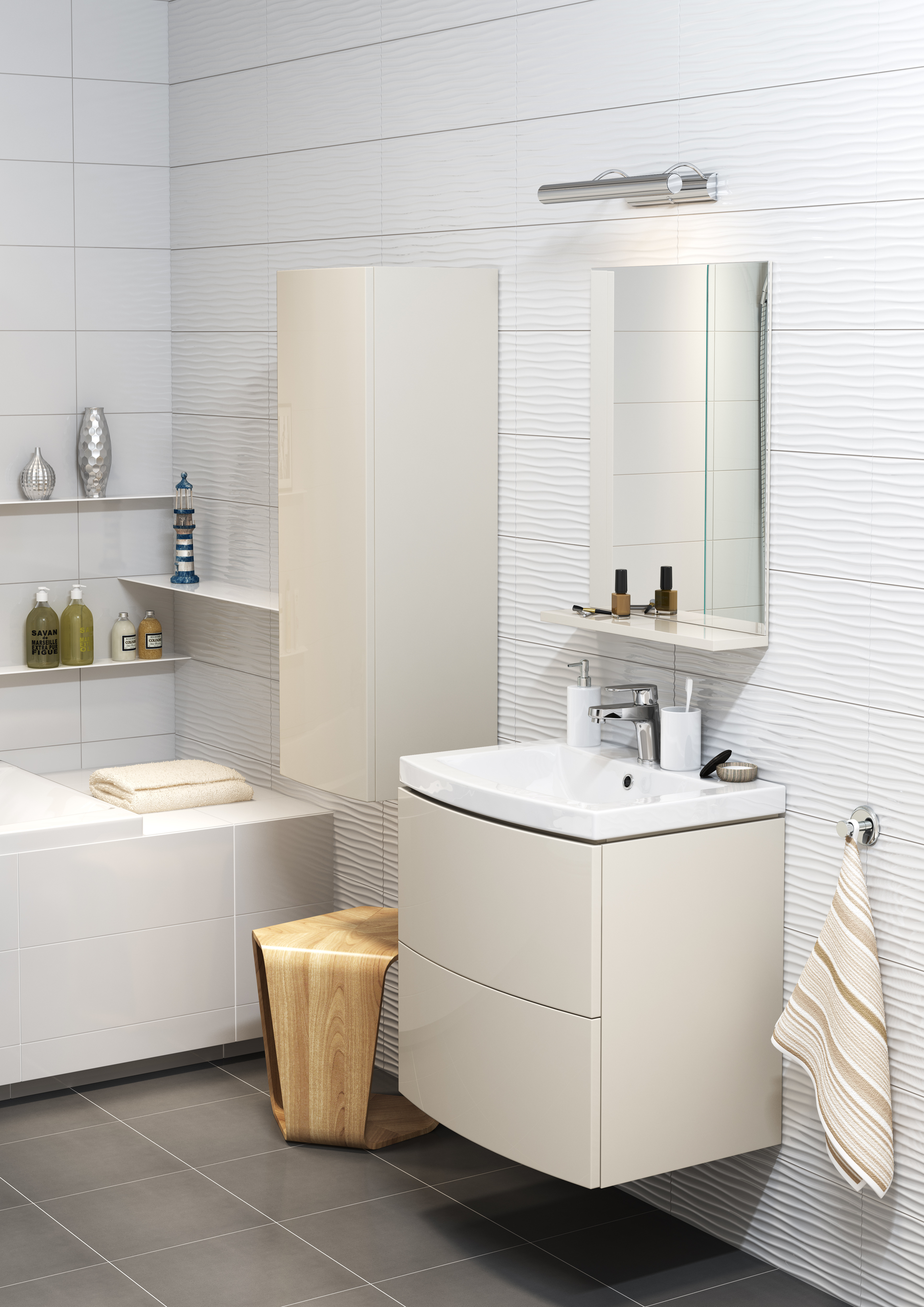 - Sammlung Farbe ermöglicht es Ihnen, mit Farben im selben Raum zu experimentieren. Vier Farben werden verwendet: weiß, gelb, blau und grau. Der Vorteil dieser Kollektion besteht darin, dass Sie selbst ein Farbset erstellen können, das Ihre persönlichen Vorlieben berücksichtigt. Eine große Anzahl von Dekoroptionen wird Ihr Badezimmer sehr schön und hell machen.