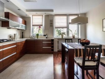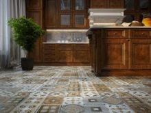 - Ein weiterer interessanter Design-Schritt - Verwendung von Textur Keramik Granitfliesen mit Woodgrain. Solch eine Beschichtung sieht natürlich aus, und aufgrund der Imitation von Holz scheinen die Böden massiv zu sein. Dieser Boden ist am praktischsten. Solche Bodenfliesen werden oft in Küchen im klassischen Stil verwendet.
