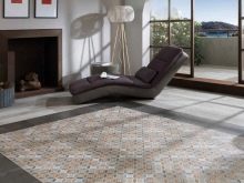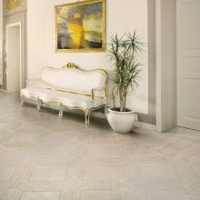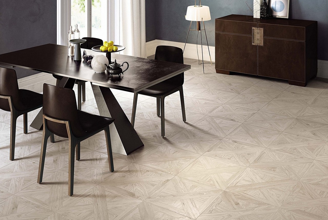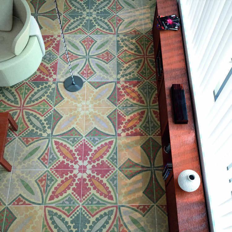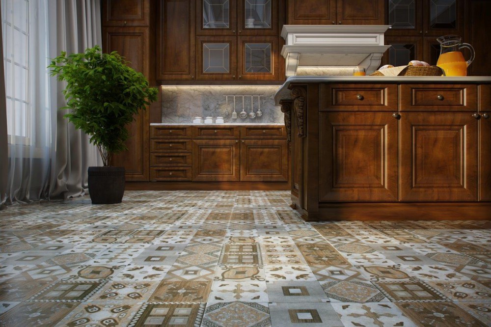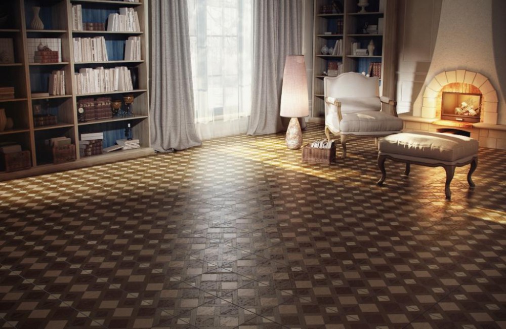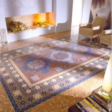 Diese Art von Feinsteinzeug ist mit natürlichen Substanzen gefärbt, daher sind einfarbige Elemente ziemlich teuer. Sie sind in Form von verschiedenen Mustern und abstrakten Mustern auf dem Boden angeordnet, das können geometrische Drucke oder im Schachbrettmuster angeordnete Beläge sein.